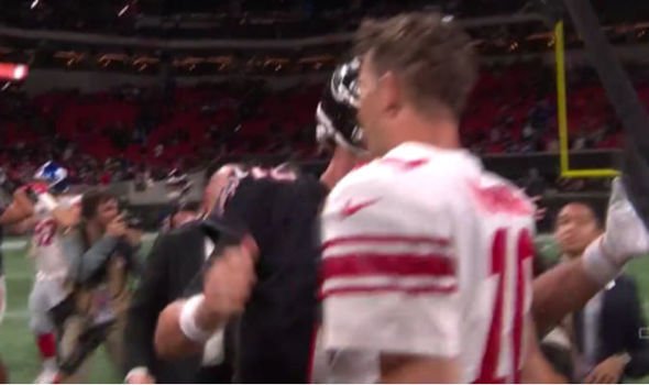 ELI MANNING and Matt Ryan embraced in an emotional moment after the Atlanta Falcons beat the New York Giants.