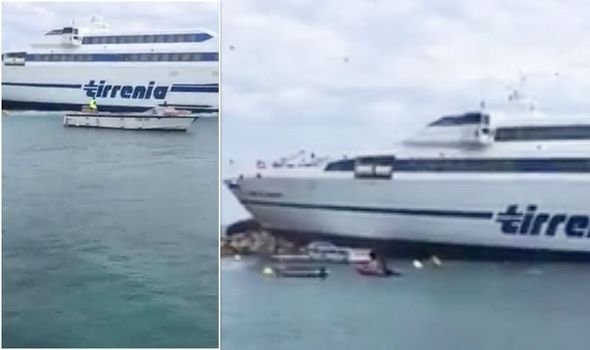 AN ITALIAN passenger ferry crashed into rocks in a port after the captain lost control of the vessel. An onshore bystander recorded the shocking aftermath.